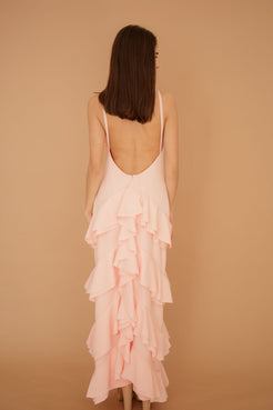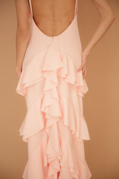Designed with mindful construction, it incorporates recycled polyester fibers, offering a touch of eco-conscious style. Whether it flows gracefully as you move or drapes elegantly at rest. Featuring a daring open back that dips gracefully, the Cora stuns with a back tail that cascades like a mermaid's fin.