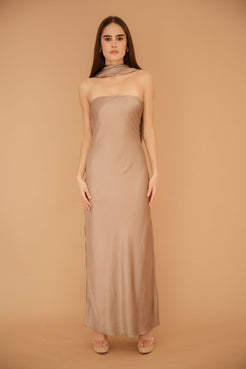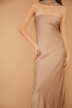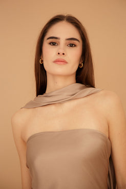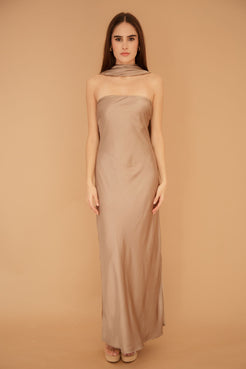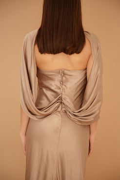 Meet Cornelia, a captivating strapless gown designed to turn heads. Crafted from EcoVero fabric with a soft, fluid drape, Cornelia features a unique, incorporated neckline that gracefully molds to the décolletage and flows organically, creating a stunning effect that extends to the back. There, the design transforms into a beautiful "wing-like" structure, adding an ethereal and dramatic touch. The gown is finished with delicately covered buttons that line the back, each one a small but exquisite detail. The gentle curve of the bodice and the sweeping silhouette give Cornelia a refined elegance, perfect for an evening that demands both grace and boldness, making it an unforgettable choice for any special occasion.
