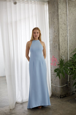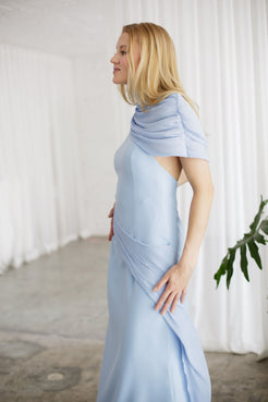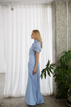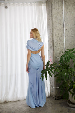 Introducing the Julieta dress, a luminous ode to fluidity and form. Crafted in soft light blue with a halter neckline and open back, her silhouette is finished with a delicate train that glides effortlessly behind you. A draped, asymmetrical chiffon cape adds sculptural movement and can be removed for a more minimalist look. Her signature detail — a pleated chiffon belt that cascades beyond the hem — offers the freedom to style her your way. With every step, Julieta speaks of grace, versatility, and quiet power.