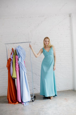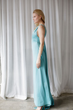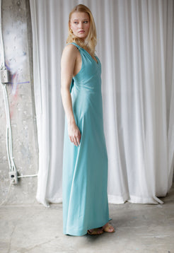 One-of-a-kind turquoise blue satin dress featuring a deep V neckline that beautifully frames the torso. Two delicate straps fall gracefully from the shoulders, adding a sense of movement and ethereal charm. A unique piece that blends sophistication with freshness.