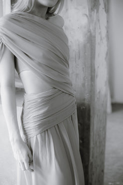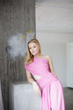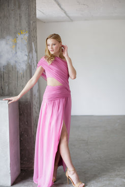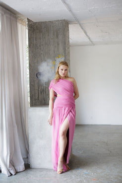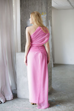 The Rosa dress is crafted in soft, draped silk chiffon in a bold yet romantic pink hue. Featuring asymmetrical lines, a one-shoulder neckline, and an artful side cut-out that celebrates the female form, this piece is finished with delicate ruching, a high slit for graceful movement, and a row of hand-covered buttons at the back for an added touch of craftsmanship.